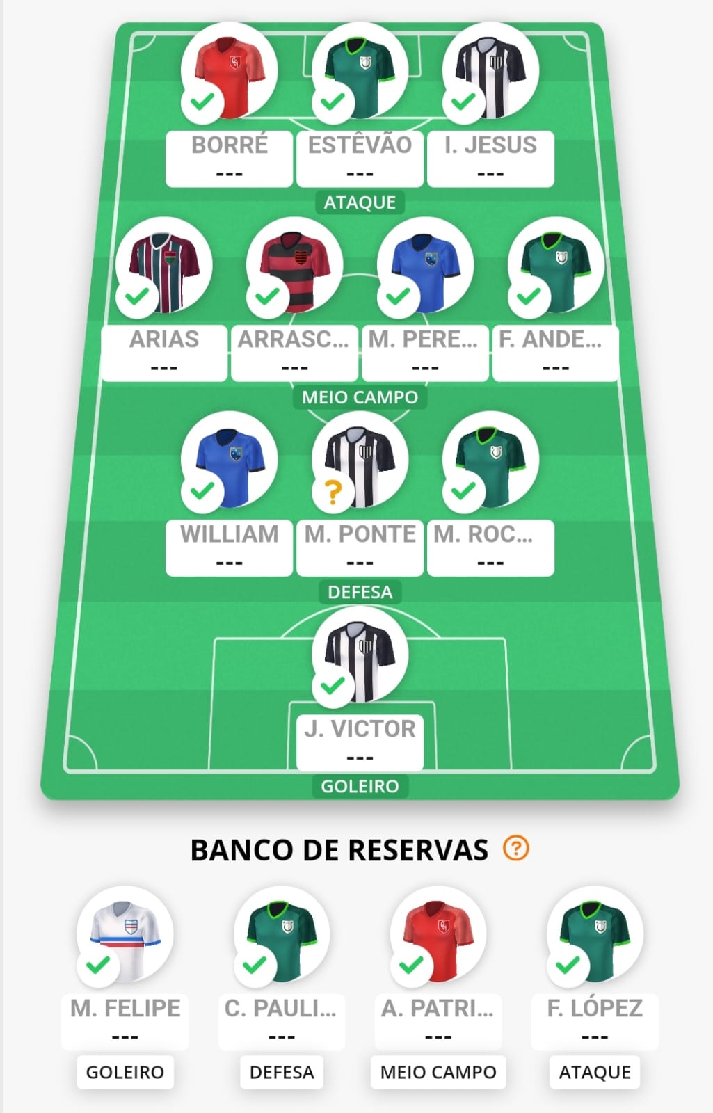 No ataque, Estêvão é unanimidade e deve mitar mais uma vez diante do Criciúma. Borré e Igor Jesus, em grande fase, têm confrontos interessantes em casa e não devem decepcionar.