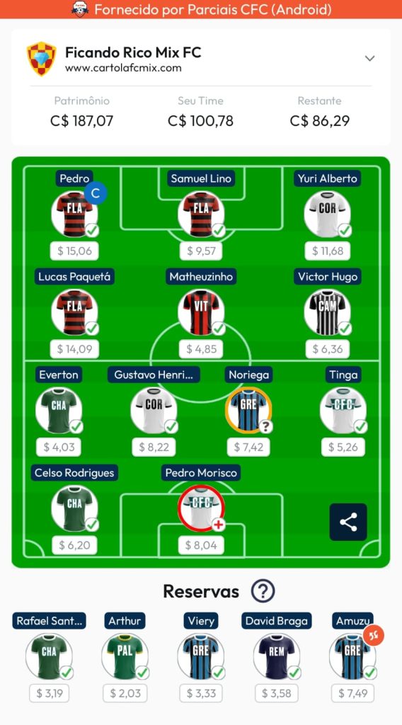 - Para quem quiser acompanhar nosso desempenho, nosso time no Cartola segue se chamando Ficando Rico Mix FC.