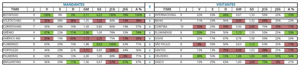 Destaques positivos mandantes da rodada: Botafogo, Grêmio e Flamengo;