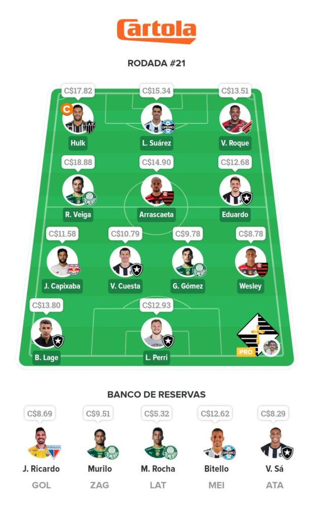 No ataque, Hulk é unanimidade. Já as vagas de Vitor Roque e Suárez seguem abertas, pois temos muitas outras boas opções na rodada. Gosto muito dos nomes de Gabriel, Victor Sá e Paulinho.