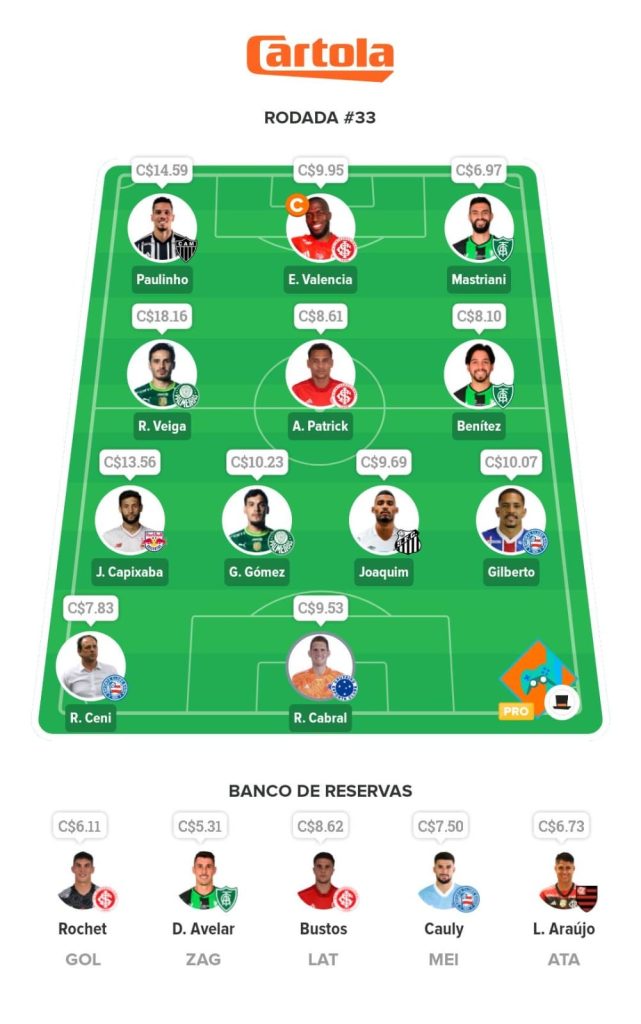Meu time custou C$127.29 e tem como treinador Rogério Ceni, do Bahia. Essa posição pode ser alterada. Meu goleiro é Rochet, do Inter, que pega um Fluminense sem grandes pretensões no Brasileirão e de ressaca do título. Nas laterais, Gilberto e Juninho Capixaba, dois laterais que costumam ter média básica. Na zaga Joaquim e Gustavo Gómez fecham o setor de defesa. O sistema defensivo pode ser alterado, nomes como Piquerez e Mauricio Lemos podem pintar no time.