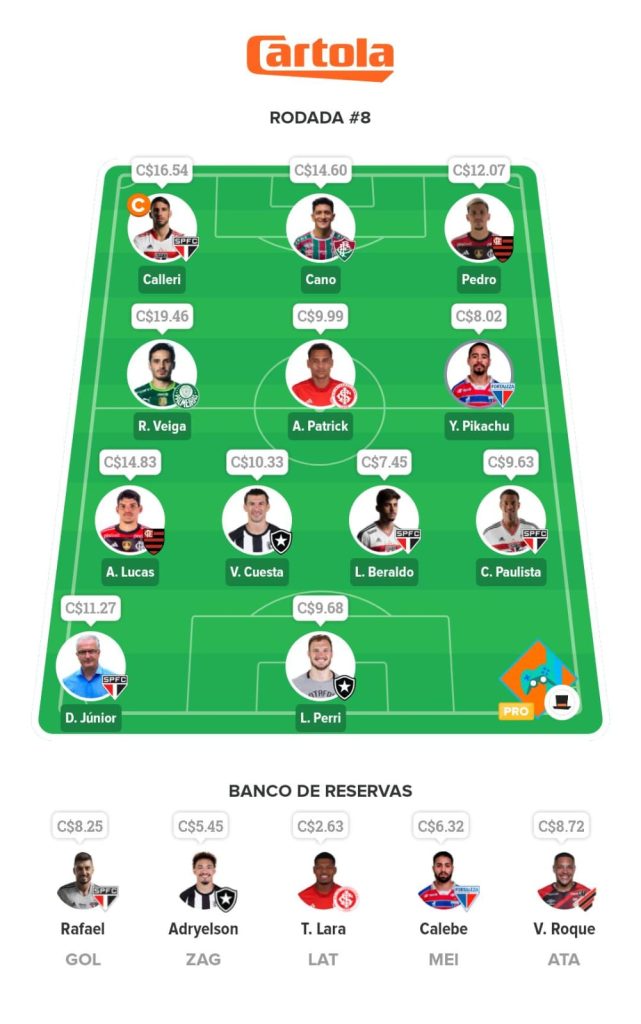No meio, Pikachu não está provável, mas teremos a escalação do Fortaleza antes do mercado fechar e se confirmado como titular, estará no meu esquadrão. Alan Patrick e Veiga são as apostas seguras da posição e referências dos seus times.