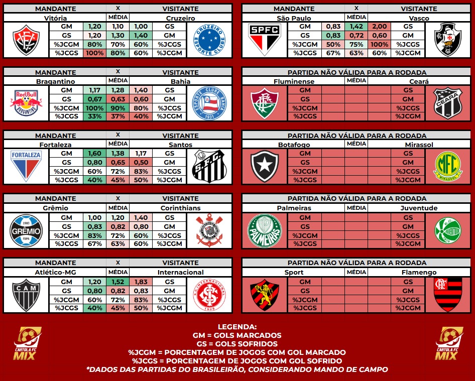 Nas primeiras rodadas, como ainda não temos um bom volume de dados do Brasileirão, vamos nos baseamos nos números da temporada 2024 (Estaduais, Copa do Brasil, Libertadores, etc.). A partir desta 6ª rodada, com mais estatísticas do campeonato, o foco passa a ser total no desempenho no Brasileirão.