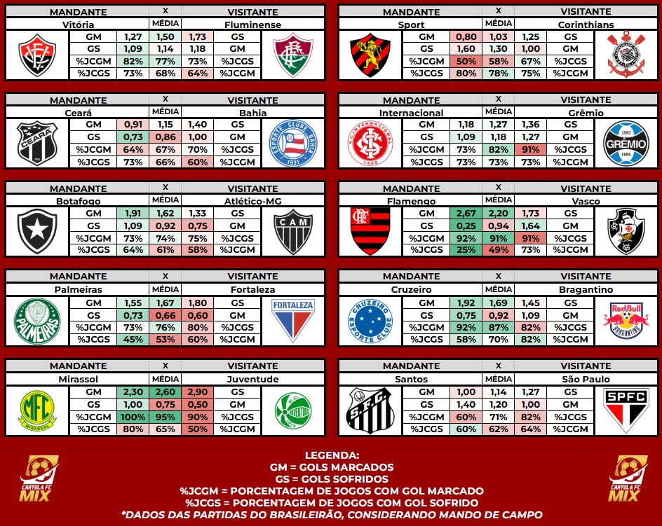 Nas primeiras rodadas, como ainda não temos um bom volume de dados do Brasileirão, vamos nos baseamos nos números da temporada 2024 (Estaduais, Copa do Brasil, Libertadores, etc.). A partir desta 6ª rodada, com mais estatísticas do campeonato, o foco passa a ser total no desempenho no Brasileirão.