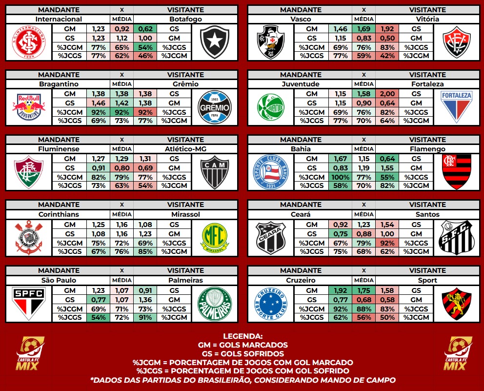 Nas primeiras rodadas, como ainda não temos um bom volume de dados do Brasileirão, vamos nos baseamos nos números da temporada 2024 (Estaduais, Copa do Brasil, Libertadores, etc.). A partir desta 6ª rodada, com mais estatísticas do campeonato, o foco passa a ser total no desempenho no Brasileirão.