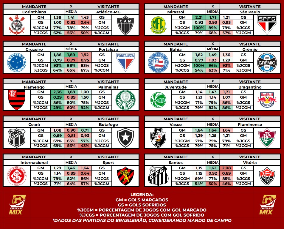 Nas primeiras rodadas, como ainda não temos um bom volume de dados do Brasileirão, vamos nos baseamos nos números da temporada 2024 (Estaduais, Copa do Brasil, Libertadores, etc.). A partir desta 6ª rodada, com mais estatísticas do campeonato, o foco passa a ser total no desempenho no Brasileirão.