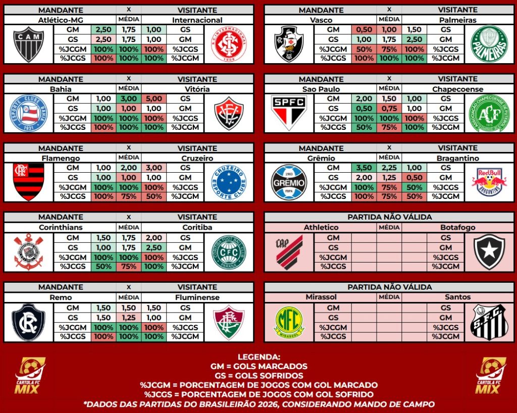 Conforme já informado, a partir da 5ª rodada os dados informados e analisados são do Brasileirão 2026.